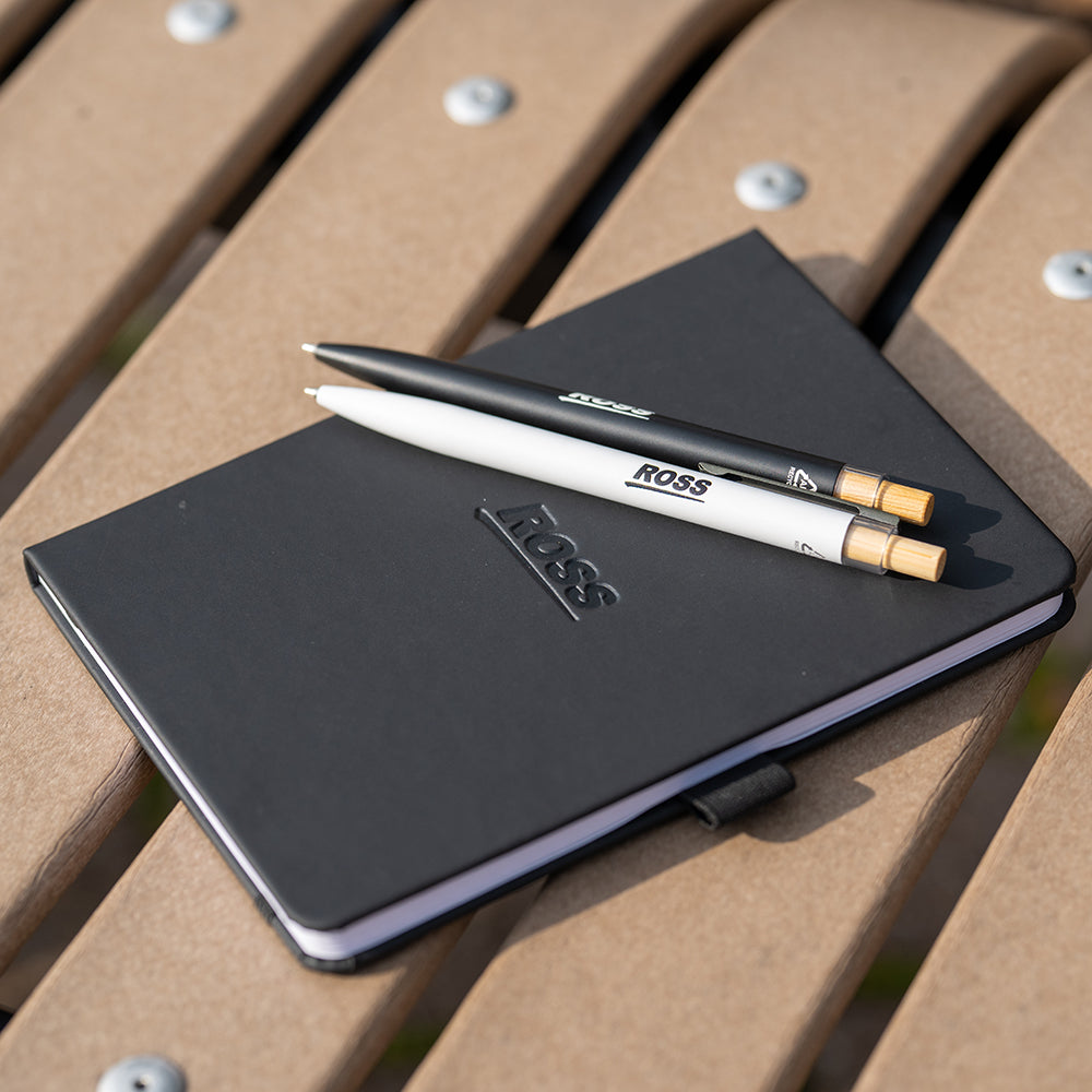 Enhance your office aesthetic with our refined Ross Reborn Pens, equipped with a recycled aluminum barrel and striking bamboo plunger.